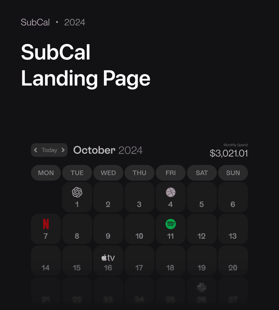 I designed SubCal’s landing page for a subscription tracking tool, making renewals and spending easy to understand at a glance.